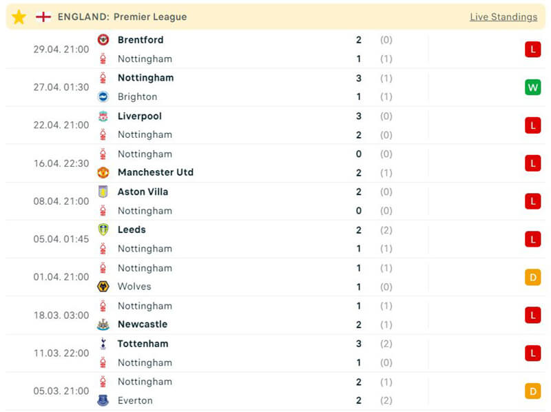 Phong độ thi đấu giữa Nottingham vs Southampton